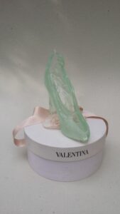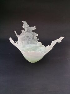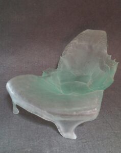 J’ai donc fait le choix de travailler le verre de recyclage, en thermofusion puis de l’associer par juxtaposition aux formes créées en argile, en adaptant les techniques de la céramique au verre moulé.